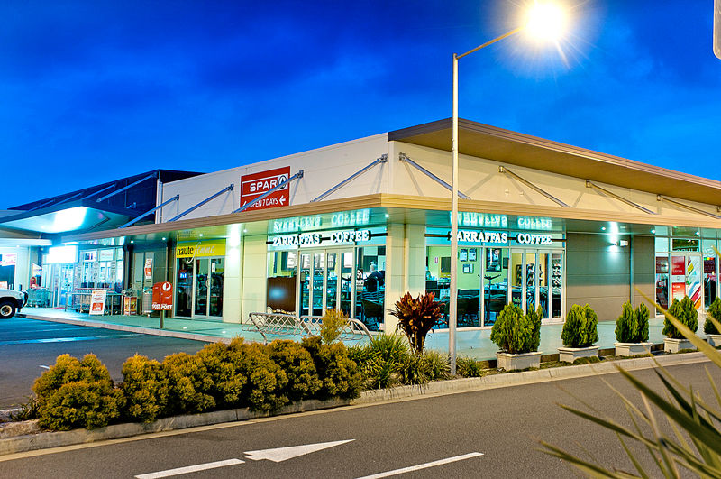 Across both stages, the design incorporated combinations of tilt-up panels and lightweight wall frames with rendered expanded polystyrene cladding. Cantilevered structural steel awnings with Alutri composite aluminium soffits were installed around building perimeters, along with standalone awnings in the car park. Stage 1 featured suspended lightweight floors over a steep embankment, large rainwater tanks reticulated to toilets and landscaping, and extensive glass bi-fold doors for restaurant tenancies. Stage 2 added feature tiling, retaining walls, a loading dock, and partial fitout of the IGA supermarket, coordinated to allow early trade commencement.
