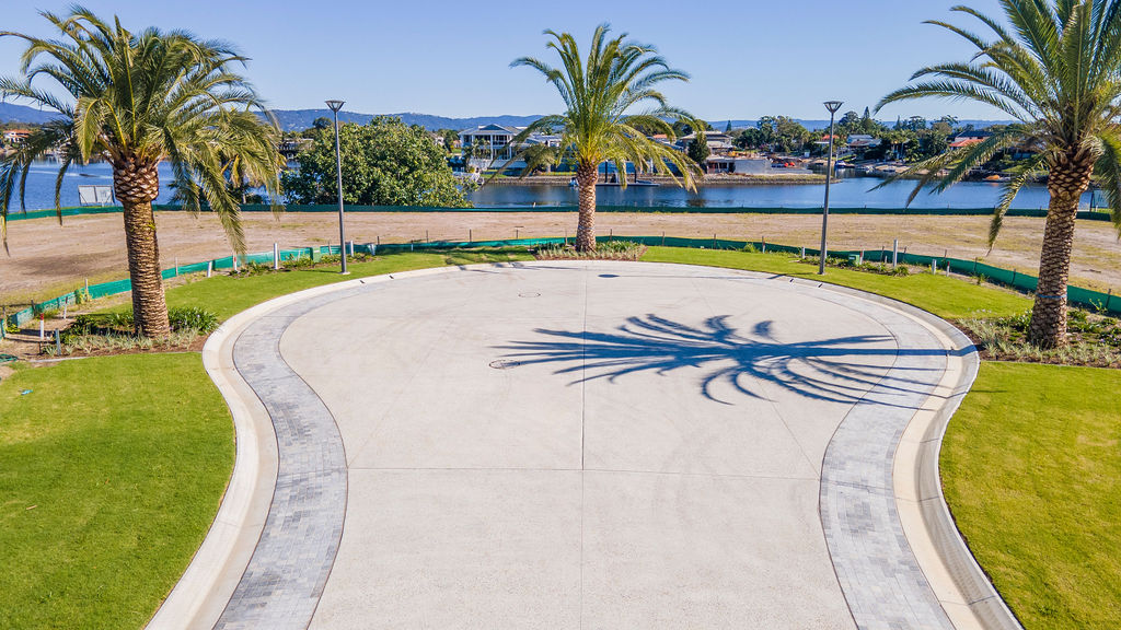 Key works included concrete sleeper retaining walls, rigid concrete pavements with architectural finishes, and installation of internal and external stormwater systems featuring a SPEL stormwater quality improvement device. Water and sewerage reticulation were completed alongside stringent erosion and sediment controls to protect the adjacent marine environment. Community engagement and logistics management were essential due to restricted site access via a residential street.