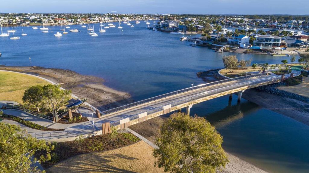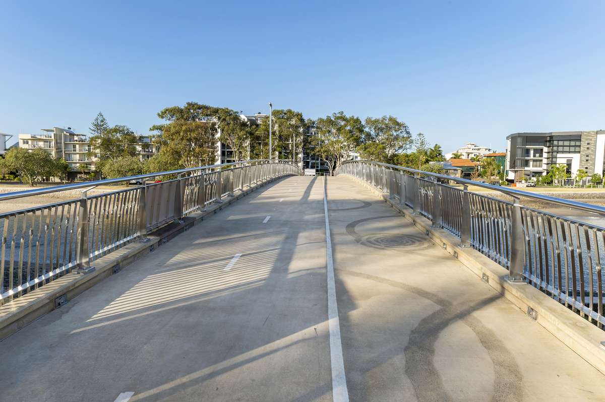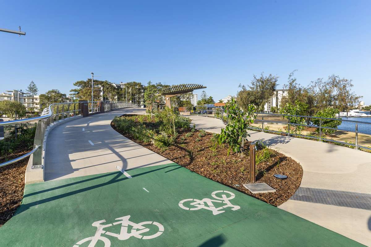 Stage 5 of the Mooloolaba to Minyama Separated Bikeway introduced a 66-metre, three-span pedestrian and cycle bridge across the environmentally sensitive Mayes Canal, improving connectivity, safety, and reducing traffic congestion.