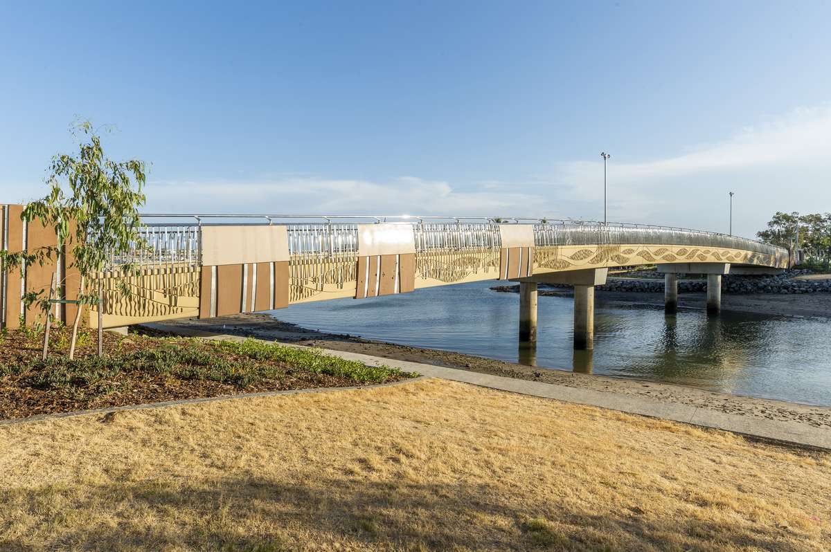 The bridge featured a 5-metre-wide shared path, architectural stainless steel balustrades, and pre-cast concrete parapets with wave-pattern detailing. Smart lighting added a dynamic visual element, while stone-pitched revetment walls enhanced the surrounding parklands. Construction required innovative solutions, including delivering piling from rock bunds to minimise environmental impact and mitigate flood risks, all while working within a busy residential and commercial precinct.