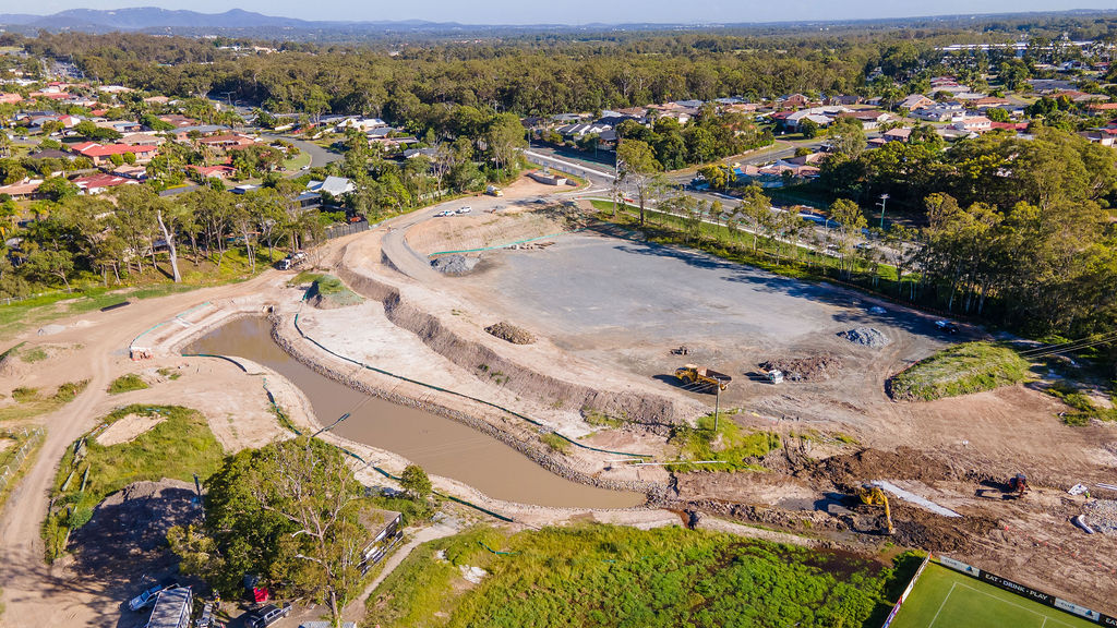 Delivery was achieved despite two significant flood events in 2022 and challenging groundwater conditions. Over 2,000 tonnes of unsuitable material were removed, and 4,000 tonnes of imported rock were placed to stabilise ground conditions and line the new dam. Works were completed adjacent to operational facilities, including the golf club and Gold Coast Titans training ground, under live traffic conditions and night works with police control.