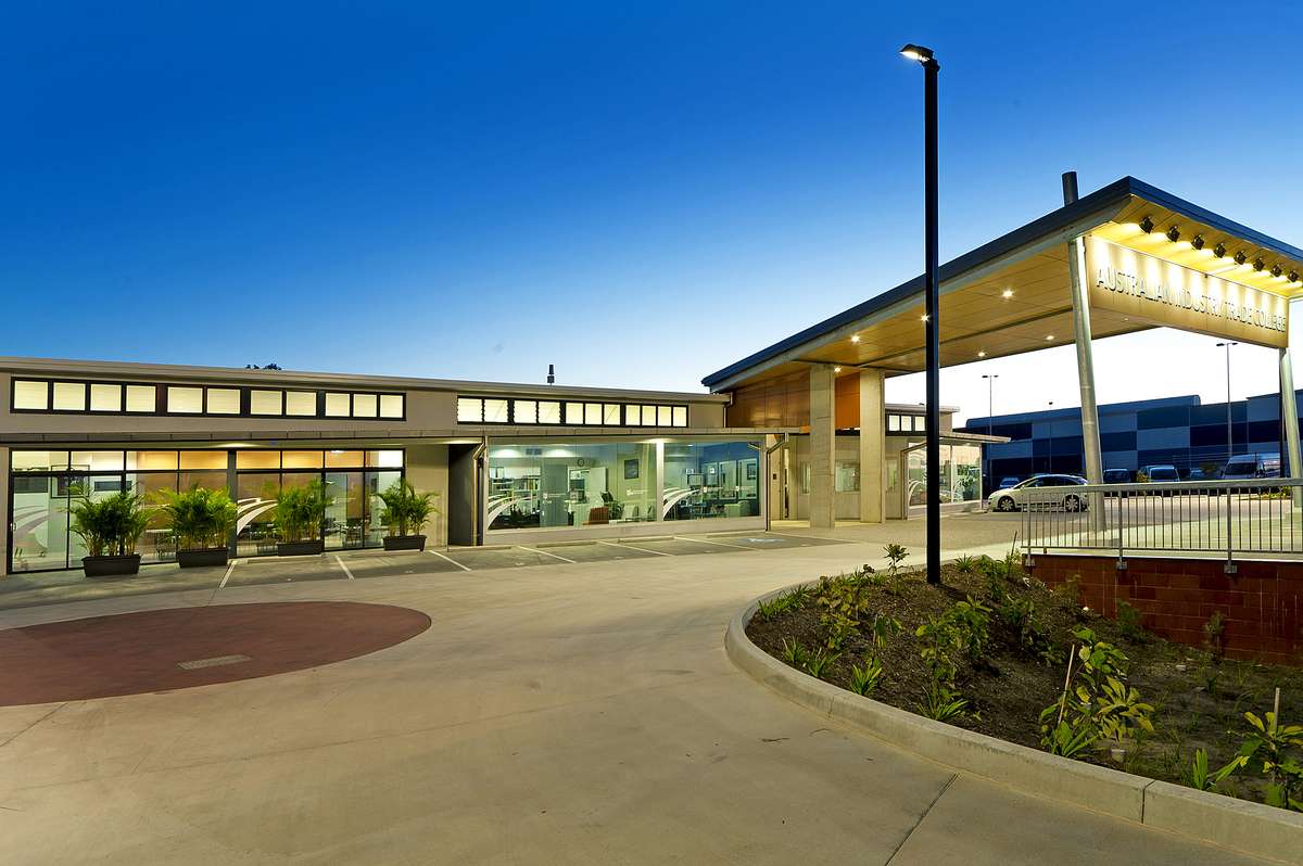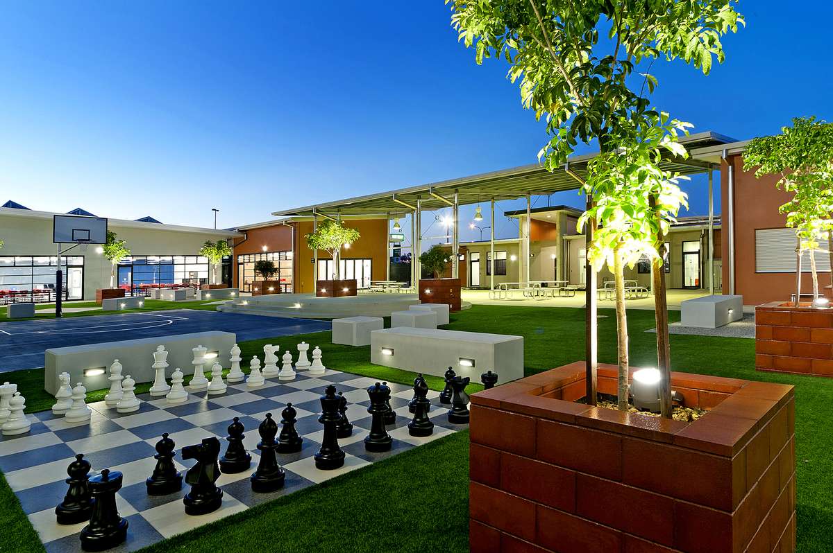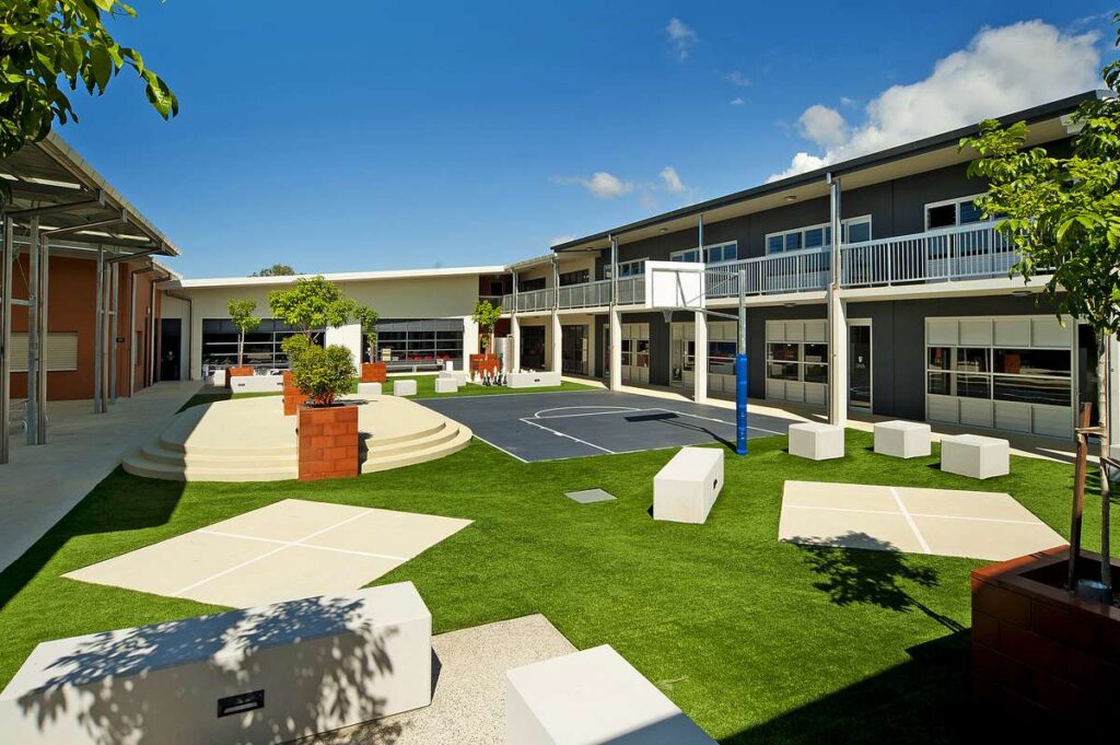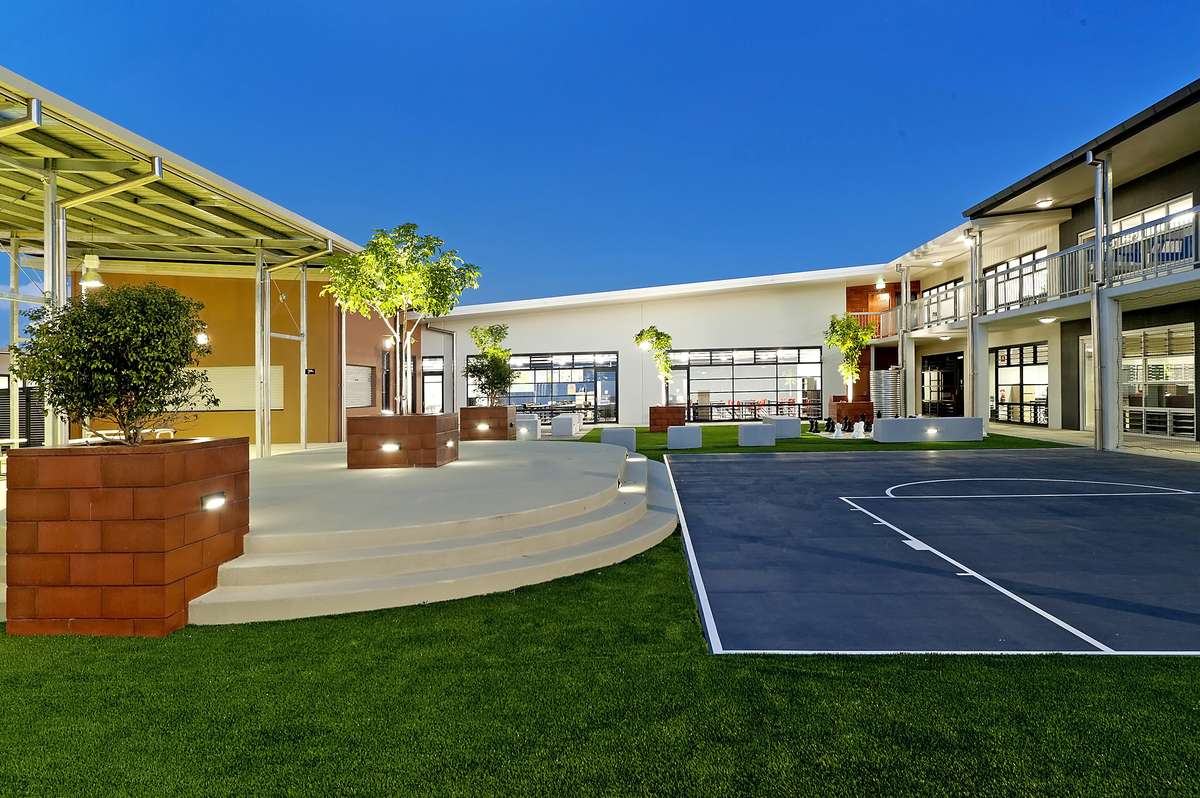 The campus featured two primary buildings—a 500m² administration wing and a 1,265m² classroom wing—with a mezzanine level added mid-construction to accommodate staff offices and amenities. The site incorporated coloured and exposed aggregate concrete across external driveways and footpaths, a miniature sports court with full-size basketball backboard, and extensive feature lighting throughout landscaped areas.
